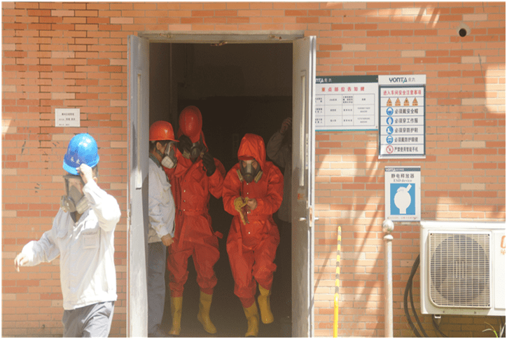 9:35, Zhou Liejun rushed to the scene in the office after receiving the call, on-site command Tang Chengwen and Zhou Zhiyuan wearing chemical suits called empty scene, ask Yang Hua to inform and assist the evacuation of 205 workshop, a notice of the comprehensive department make bright hole and organizing the evacuation workshop.
