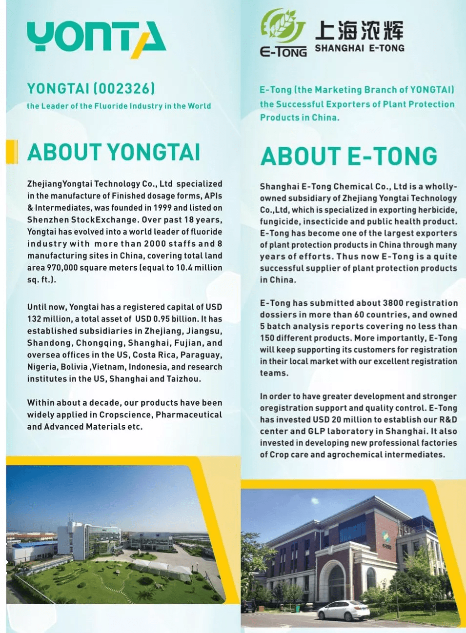 本次展會(huì)上,永太科技攜全資子公司上海濃輝化工有限公司將聯(lián)袂出席,將為您呈現(xiàn)農(nóng)藥原藥,農(nóng)藥中間體,含氟基礎(chǔ)中間體等產(chǎn)品,并提供定制加工服務(wù),特邀您蒞臨參觀,與全球農(nóng)化行業(yè)專業(yè)人士共襄盛會(huì)。