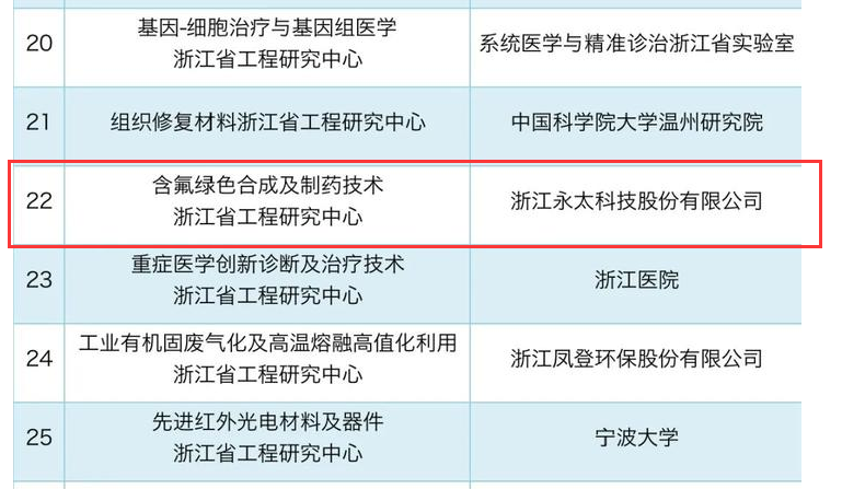 名單,永太科技申報的“含氟綠色合成及制藥技術(shù)浙江省工程研究中心”成功入選。
