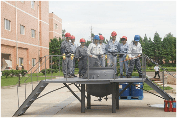 到15:00,隨著應急總指揮羅建榮先生的一聲令下“開始演練”,車間操作工人立馬在鋼平臺上模擬平時格氏反應滴加操作過程。兩分鐘后,點火人員在現(xiàn)場解說員的指導下,點起反應釜內的燃料,模擬格氏反應液滴加過快導致沖料引起火災的事故。此時,一名操作工受輕傷,另一名操作工因離反應釜較近,受沖擊波影響,受傷較重。班組長發(fā)現(xiàn)火情后,立馬組織操作工用車間的干粉滅火器對火情進行控制,同時向車間主任和廠長匯報,啟動車間火災報警器,啟動火災應急預案。此時火勢擴大,車間內干粉滅火器已經用完,火情無法控制住。此時,班組長馬上下達撤離指令,組織車間人員緊急撤離至安全地點。