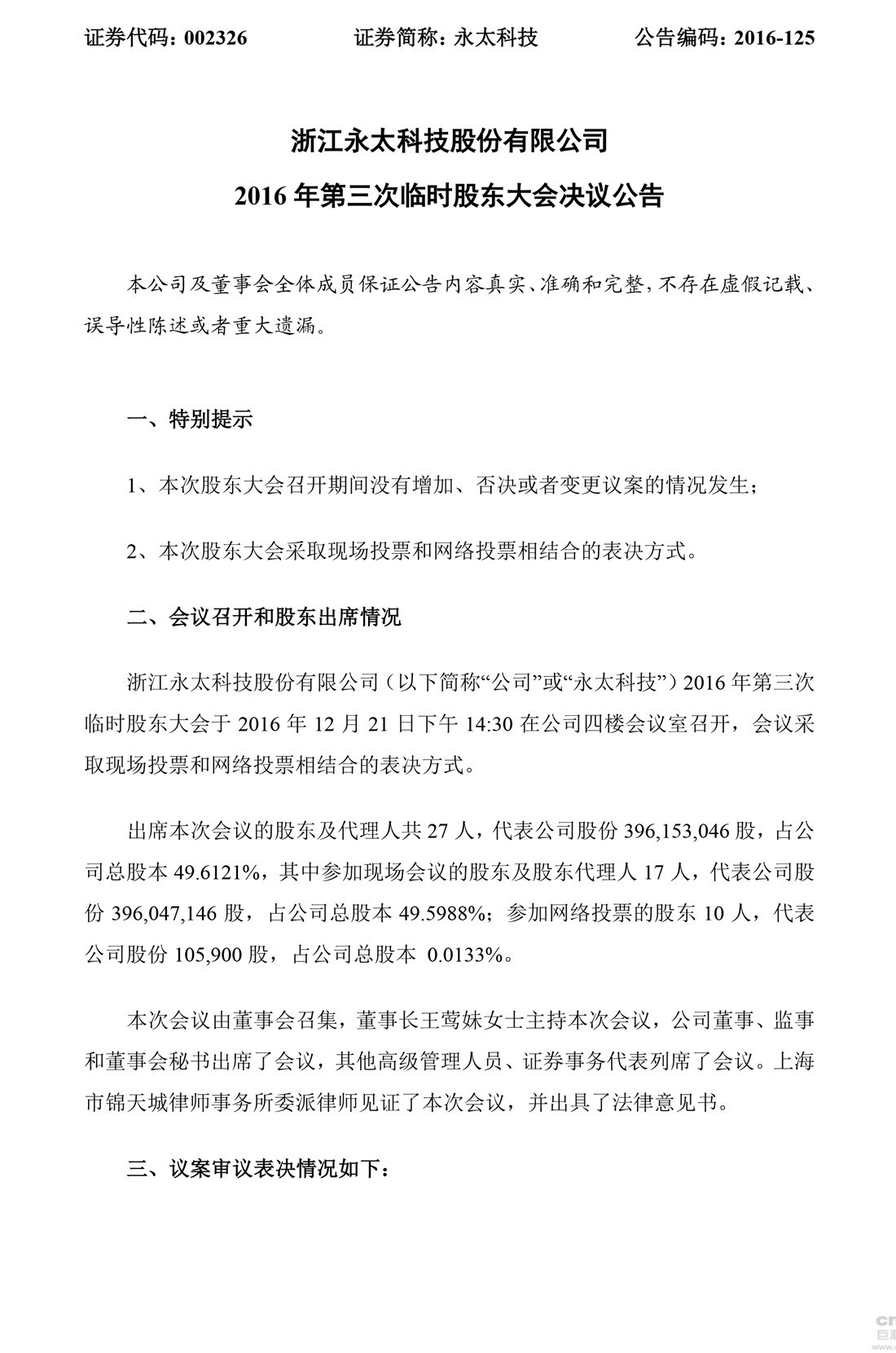 永太科技:2016年第三次臨時股東大會決議公告