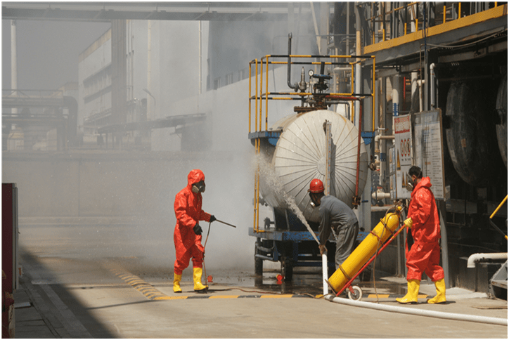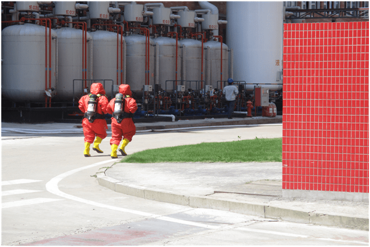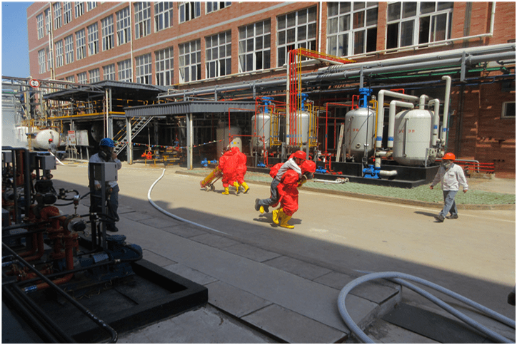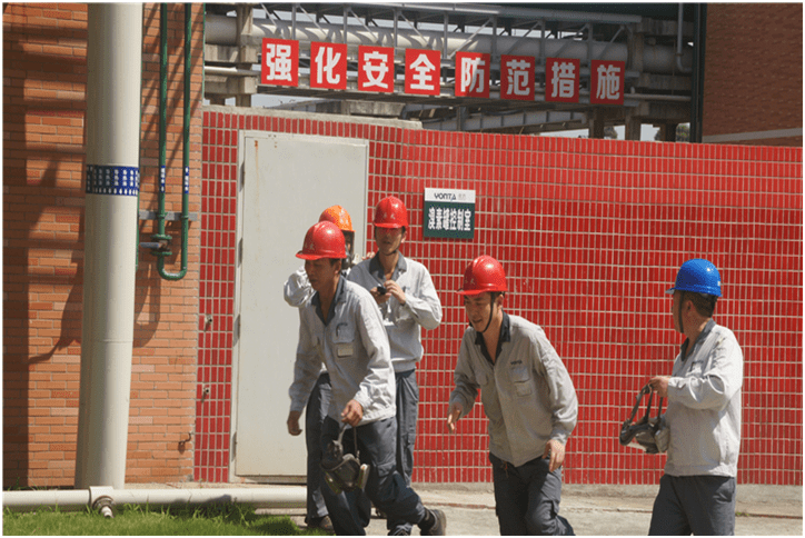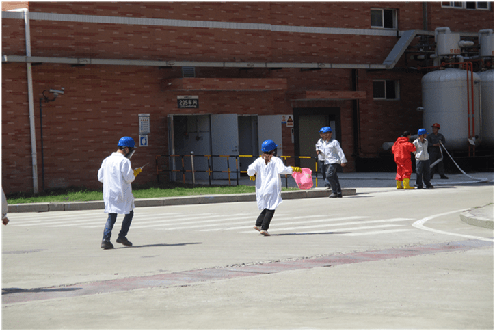 上午9:30,EHS總監(jiān)王梓臣向204演練人員牛群發(fā)布演練命令,演練開(kāi)始。牛群打開(kāi)發(fā)煙罐模擬溴素泄漏暈倒在現(xiàn)場(chǎng),隨行的潘和平馬上撤離并向204車(chē)間主任周烈軍報(bào)告;