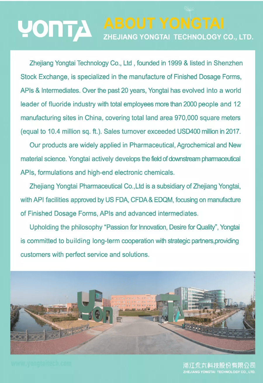 本次展會上,永太科技攜子公司浙江手心制藥有限公司、佛山手心制藥有限公司聯(lián)袂出席,將為您呈現(xiàn)含氟醫(yī)藥中間體、醫(yī)藥原料藥、醫(yī)藥制劑等產(chǎn)品,并提供定制加工服務(wù),特邀您蒞臨參觀,與全球制藥行業(yè)專業(yè)人士共襄盛會。